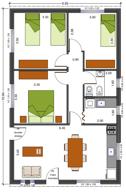 Vivienda de 72 metros cuadrados, 3 dormitorios, cocina-comedor, baño y lavadero.