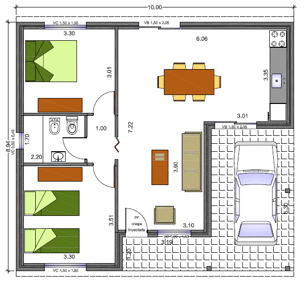 Vivienda de 90 metros cuadrados, 2 dormitorios, cocina-comedor y baño.