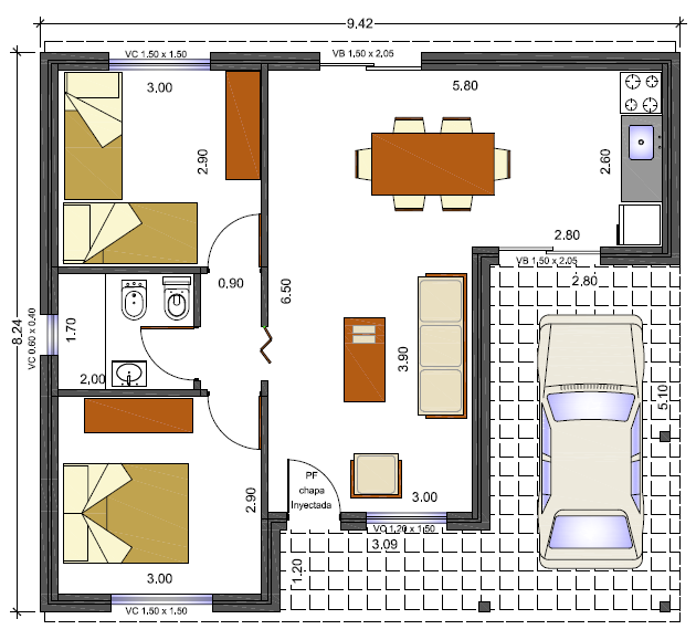 Vivienda de 75 metros cuadrados, dos domitorios, cocina-comedor, baño, cochera y porche.